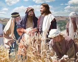 Passava Jesus através das searas num dia de sábado e os discípulos apanhavam e comiam as espigas, debulhando-as com as mãos. Alguns fariseus disseram «Porque fazeis o que não é permitido ao sábado?». Respondeu-lhes Jesus: «Não lestes o que fez David, quando ele e os seus companheiros sentiram fome? Entrou na casa de Deus, tomou e comeu os pães da proposição, que só aos sacerdotes era permitido comer, e também os deu aos companheiros». E acrescentou; «O Filho do homem é senhor do sábado».