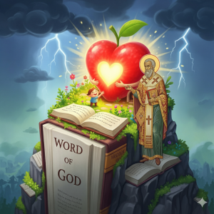• The Word as a pulsating heart: An apple tree grows from the Bible, bearing a heart-shaped fruit that glows intensely. This suggests that the Word of God is not just a text, but something alive, full of love, and nourishing to the spirit (just as an apple nourishes the body). The heart symbolizes God’s love, the essence of the gospel.