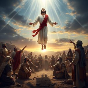 No centro, uma figura que representa Jesus Cristo flutua no ar, com os braços estendidos e o olhar voltado para o céu. Ele está envolto por raios de luz intensa que descem de uma abertura nas nuvens, simbolizando uma presença divina. A cena se passa ao pôr do sol ou nascer do sol, com um céu dramático e dourado.