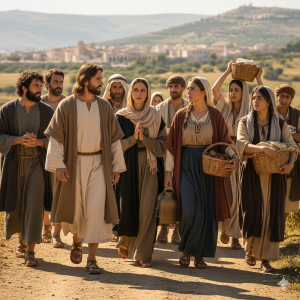 **Descrição:** Vemos Jesus a caminhar, ensinando com gestos animados aos Doze que O rodeiam. Uns passos atrás, mas visíveis e determinadas, um grupo de mulheres caminha junto. Uma delas carrega um cesto com pão e fruta, outra leva um odre de água, outra uma sacola com mantas. Os seus rostos não são de cansaço, mas de serena determinação e profunda paz. A luz da tarde incide sobre o grupo inteiro, unindo-os num mesmo propósito. A imagem transmite movimento, comunidade, serviço e a partilha da jornada missionária.