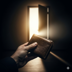 Uma balança: de um lado, moedas a pesar; do outro, uma cruz iluminada. O olhar é conduzido para a cruz, lembrando que só Deus é Senhor.